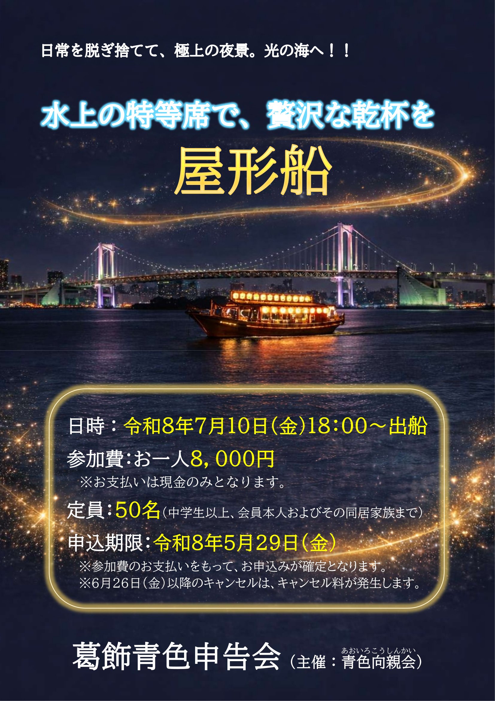 日 時:令和8年7月10日(金) 18:00出船(約2時間30分の周遊)