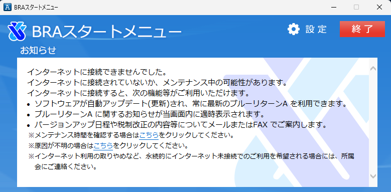 BRAスタートメニューのお知らせ欄に「インターネットに接続できませんでした。」と表示されてしまう。