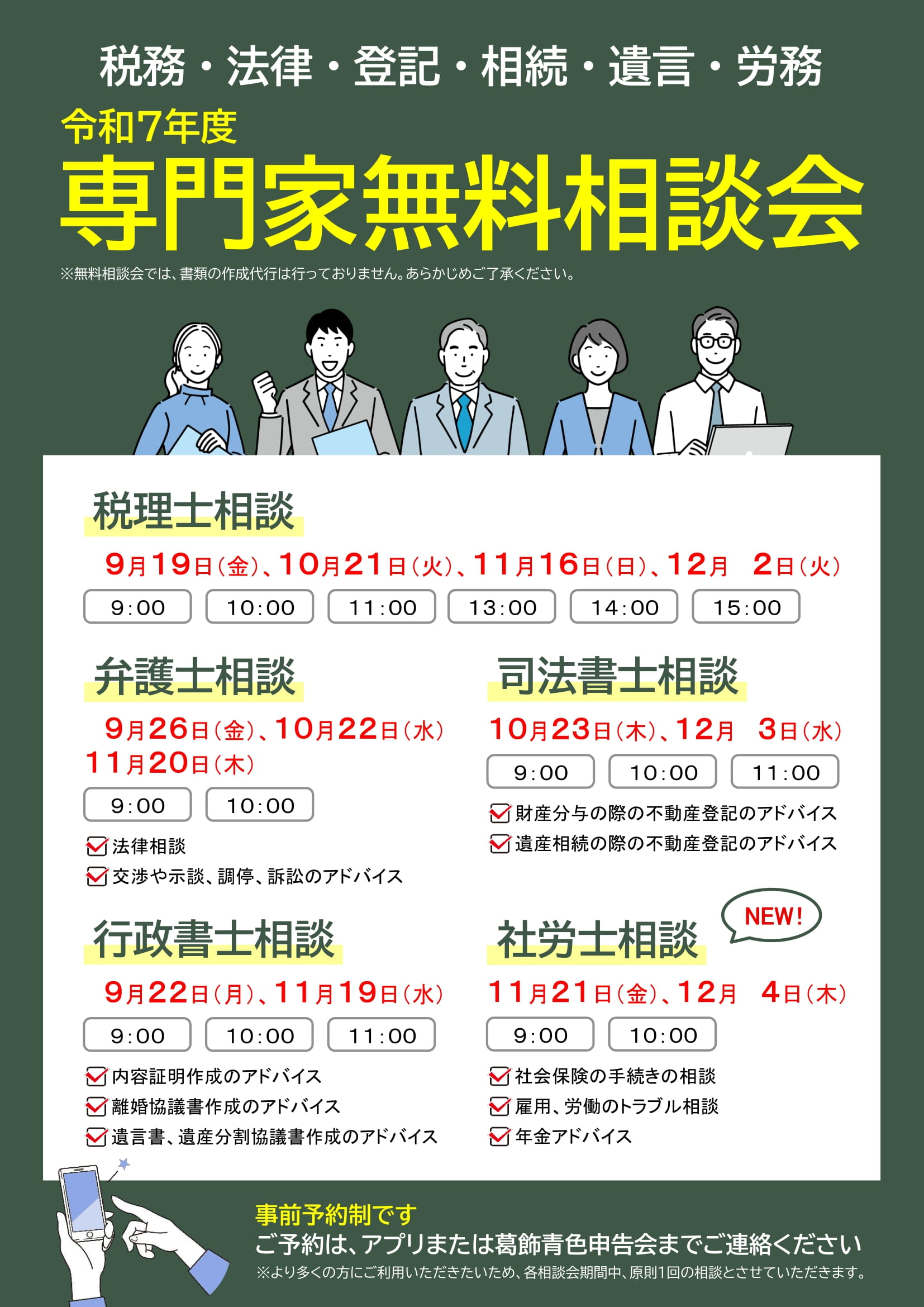 ご予約は、青色アプリまたは葛飾青色申告会までご連絡ください。