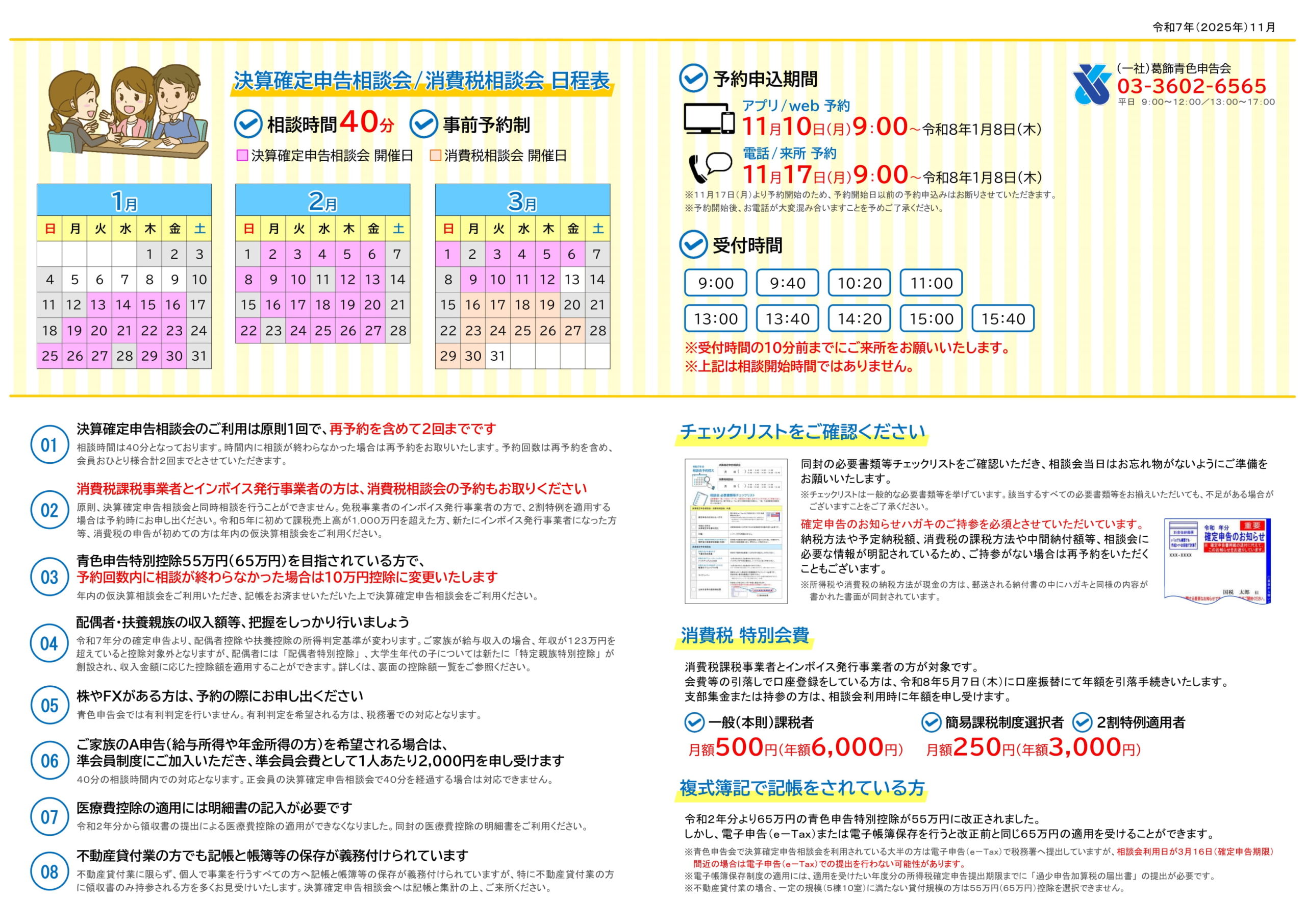 11月17日(月)より確定申告相談会・消費税相談会の予約が始まっております。