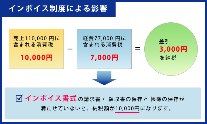 インボイス制度は、消費税にまつわるものです。 消費税を確定申告する事業者は、自身が販売側・サービス提供者から発行されるインボイス書式の請求書や領収書(「適格請求書」といいます)を保存し、帳簿へ記帳をし保存しておかないと、消費税の納税額が多くなってしまいます。