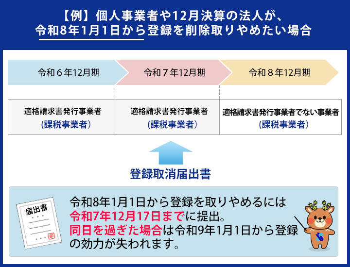 提出期限は、翌課税期間の初日(個人事業者の場合、翌年1月1日)から起算して15日前の日までとなり、この期限までに登録取消届出書を提出することで、翌課税期間の初日からインボイス登録がなくなります。